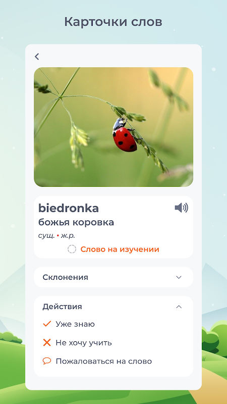 Voor elk woord in onze applicatie is er een functionele kaart. Naast het visualiseren van het woord, kunt u de uitspraak van het woord, gebruiksvoorbeelden en vervoegingsopties voor werkwoorden vinden. Dankzij dit kun je een woord aan het woordenboek toevoegen en het woord opnieuw leren als het moeilijk is of als je het bent vergeten. Als je een woord al uit je hoofd hebt geleerd of al eerder hebt geweten, kun je het altijd als ‘al geleerd’ markeren en niet verder studeren.
