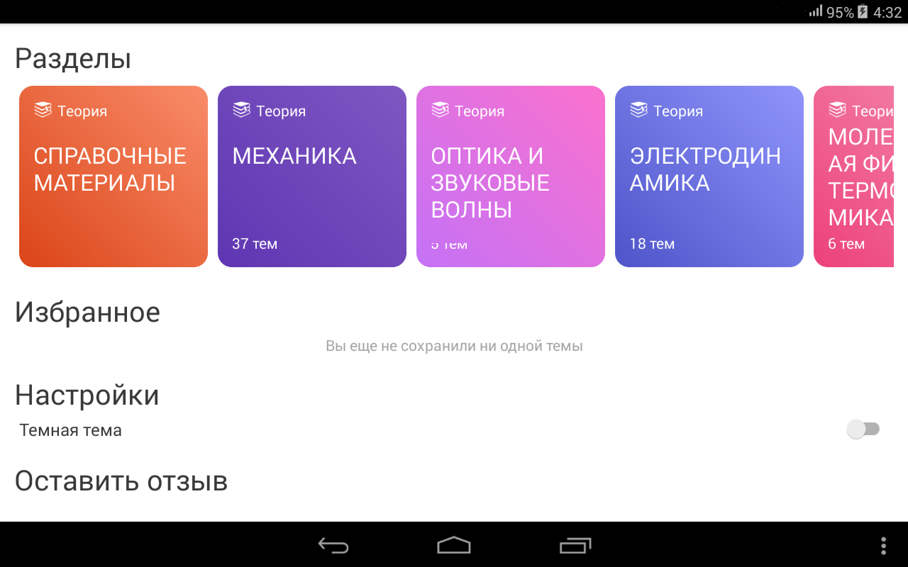 Легкий и удобный справочник по физике с темной темой поможет вам подготовиться к ЕГЭ и ОГЭ (ГИА), а также к другим экзаменам по физике. Содержит в себе большое количество шпаргалок, разбитых по темам: "Механика", "Молекулярная физика и термодинамика", "Электродинамика", а также "Оптика и звуковые волны".
