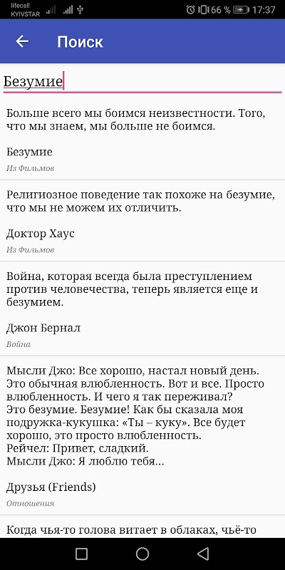 De applicatie bevat wijze citaten en aforismen over de volgende onderwerpen: grappen, armoede, rijkdom, oorlog, tijd, droevige citaten, kinderen, vriendschap, leven en dood, wet, gezondheid, uit boeken, uit films, ruimte, schoonheid, mensen, mode, Motiverende citaten, wijze citaten, man en vrouw, over geld, eenzaamheid, relatie, politiek, verraad, plezier, over liefde, reizen, drinken, werk, paradijs en hel, religie, risico, Rusland, sarcastische citaten, vrijheid, familie, sport , Geluk, Voetbal.