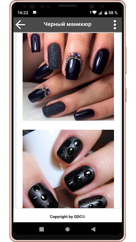 В нашем приложении Вы найдёте уникальные идеи маникюра, которые будут радовать Вас. С помощью приложения «Чёрный маникюр», Вы будете оригинально выделяться среди друзей и знакомых. В приложении вы найдете более 100 неповторимых идей маникюра и дизайна ногтей. В тоже время, Вы всегда сможете подобрать определенный стиль, который будет отличать Вас от окружающих. Наше приложение подойдет как взрослым самостоятельным женщинам, так и юным энергичным девушкам. Радуйте себя и будьте всегда на Олимпе стиля.