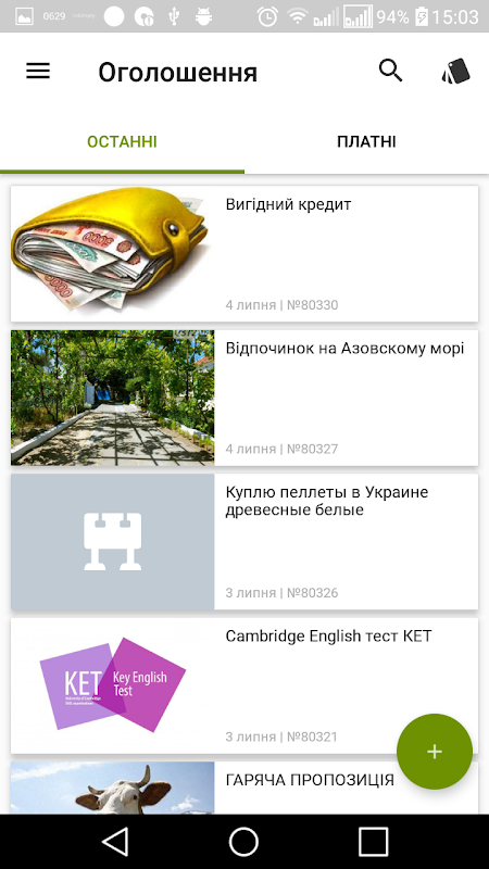* знаходьте оголошення будь-якої категорії в зручній дошці оголошень. Усі види транспорту, нерухомості, товарів і послуг дивіться у простому і зручному інтерфейсі