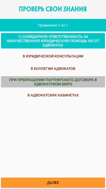 Een eenvoudige interface stelt u in staat om overal training te geven, onthoud de belangrijkste punten van de federale wet "Op belangenbehartiging en de advocatuur in de Russische Federatie" en de beroepsethiek van een advocaat.