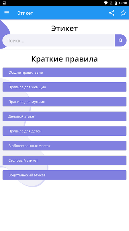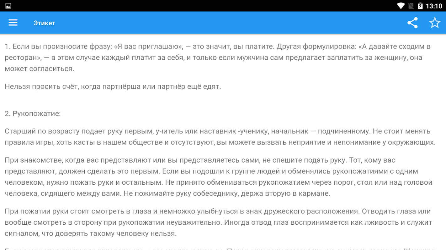 Moderne etiquette is een soort code van goede manieren en gedragsregels. In de applicatie leert u hoe u elkaar op de juiste manier kunt ontmoeten, elkaar kunt begroeten, hoe u zich moet gedragen in een theater, winkel, openbaar vervoer, hoe u bezoek kunt brengen en gasten kunt ontvangen, hoe u een diplomatieke receptie of een familievakantie organiseert (feest), hoe u de tafel moet dekken en nog veel meer. Kennis van etiquette stelt iemand in staat een prettige indruk op anderen te maken met zijn uiterlijk, manier van spreken, het vermogen om een gesprek te voeren en zich aan tafel te gedragen.