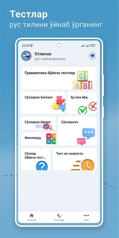 Testlar bўlimida tilni qizikarli va oson ўrganish uchun 8 hil turdagi testlar mavzhud: