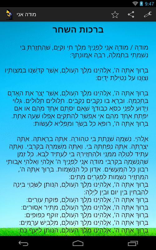 אפליקציית מודה אני - ברכות השחר לתפילה בכל בוקר עם ההשכמה מכילה את התפילה בטקסט מנוקד.