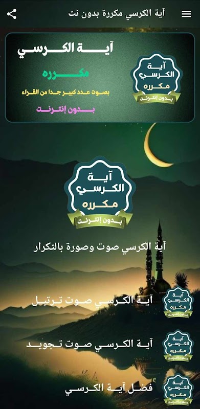 De toepassing van Ayat al-Kursi herhaald in audio zonder internet combineert Ayat al-Kursi geschreven in audio en video met een uitleg van de deugd van het reciteren ervan in de ochtend- en avondherinneringen of voor het slapen gaan.
