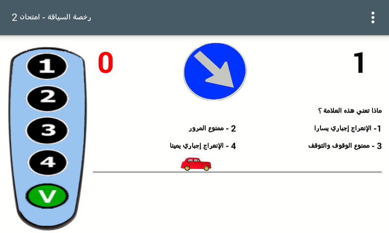 * De gebruiker bestuurt de auto, leest de vraag en begrijpt deze goed, kiest vervolgens het juiste antwoord uit de beschikbare opties, drukt vervolgens op de bevestigingsknop (V) om zijn punt te krijgen en na het voltooien van de veertig vragen krijgt hij zijn totale punt.