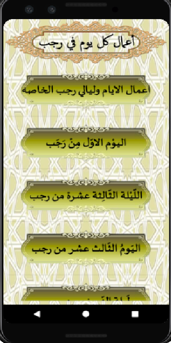 أعمال الاشهر رجب وشعبان ورمضان ويحتوي على اعمال الليالي والايام مقسمه ومفهرسه وكذالك الاعمال العامه والاعمال الخاصه ويحتوي الفهرس اعمال كل شهر وكل يوم وكل ليله وكذالك يتميز هذا التطبيق :
