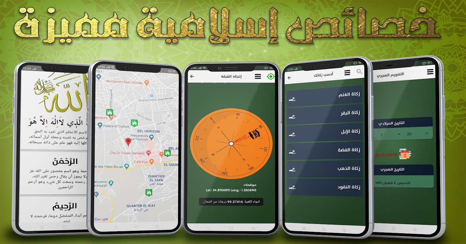 En een kompas om de richting van de qibla te kennen en het kenmerk van het identificeren van de dichtstbijzijnde moskee om de gelovige en de moslim te helpen in zijn dagelijks leven
