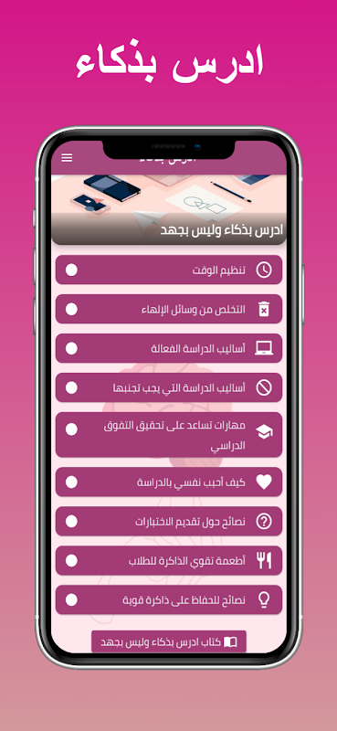 تطبيق ادرس بذكاء سيساعدك على تنظيم الوقت والتخلص من وسائل الالهاء اثناء الدراسة ويقدم لك افضل اساليب الدراسة الفعالة ويحذرك من اساليب الدراسة التي يجب تجنبها ويوفر لك مهارت تساعدك على تحقيق التفوق الدراسي وطرق كيف احبب نفسي بالدراسة ويقدم اقوى النصائح حول تقديم الامتحانات بالاضافة يوفر لك كتاب ادرس بذكاء وليس بجهد