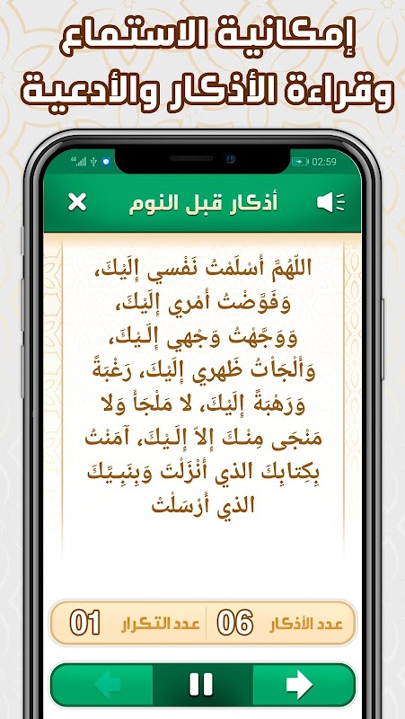 De applicatie bevat alle belangrijke dhikr, zoals ochtend- en avond-dhikr, slaap-dhikr en dhikr na het gebed, inclusief geschreven ochtend-dhikr en geschreven avond-dhikr, met de mogelijkheid van herhaling om het onthouden te vergemakkelijken.