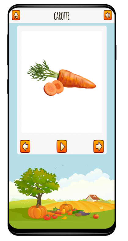 تم تصميم هذا التطبيق اسماء الفواكه والخضروات والمكسرات بالفرنسية ، كلعبة تعليمية مجانية بحيث يمكن للأطفال ما بين 4 سنوات وما فوق التعرف على الخضروات والفواكه و المكسرات اليومية التي يتم استخدامها واستهلاكها من قبل الجميع في منازلنا وكيف تبدو..
