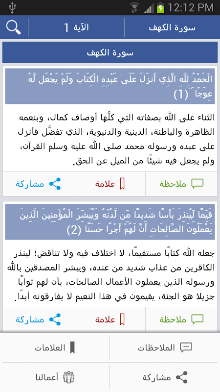 تفسير القران الكريم كامل بدون انترنت وفيه فهرس السور وفهرس آيات السورة المختارة وإمكانية البحث في القرآن الكريم مع إمكانية كتابة ملاحظة على إعراب آية معينة وإمكانية وضع علامات متعددة على الآيات وإمكانية مشاركة نص الآية مع إعرابها عبر الفيس بوك والواتس أب وغيره وقائمة بجميع الملاحظات المكتوبة وقائمة بجميع الآيات التي عليها علامة
