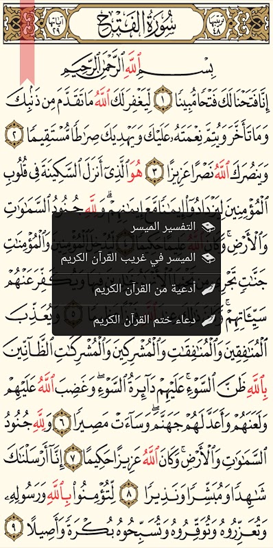 De volledige Heilige Koran zonder internetverbinding, en volledig identiek aan de papieren Koran, met daarnaast de zoekfunctie, eenvoudige interpretatie, betekenissen van de woorden van de Heilige Koran, smeekbeden uit de Heilige Koran, de mogelijkheid om het gebed te voltooien, de mogelijkheid om een bladwijzer te plaatsen, een index van de soera's, een index van de onderdelen en secties, en de mogelijkheid om naar elke gewenste pagina te gaan. Het programma houdt het scherm verlicht voor wie lang wil doorlezen, met de mogelijkheid om de helderheid van het scherm te regelen en de mogelijkheid om in de nachtmodus te lezen. Als het programma op een bepaalde pagina wordt gesloten en opnieuw wordt geopend, gaat het automatisch terug naar de pagina waar het werd gesloten, naast de mogelijkheid om zowel horizontaal als verticaal te lezen, met een helder lettertype en een achtergrondkleur die prettig is voor het oog.