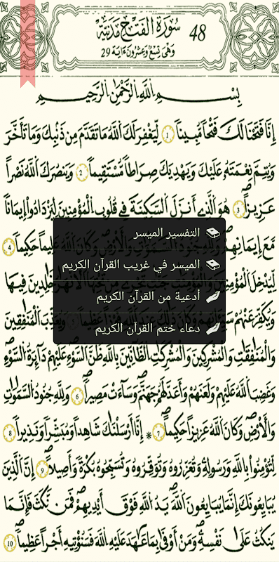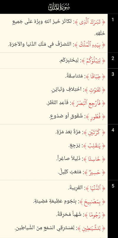 De Heilige Koran is compleet zonder internetverbinding, en is volledig identiek aan de papieren Koran met de vertelling van Qalun, het kenmerk van het doorzoeken van de Heilige Koran, de gemakkelijke en gemakkelijke interpretatie in het vreemde deel van de Heilige Koran 'an, de betekenis van de woordenschat, smeekbeden uit de Heilige Koran, de smeekbede om de Heilige Koran af te sluiten, de mogelijkheid om een markering te plaatsen en er later naar terug te keren, een index van soera's, een index van delen, delen, en kwartalen, en controle van de mate van helderheid. Het scherm en de leesmodus staan in de nachtmodus en het lezen in horizontale en verticale modus. Als het programma op een bepaalde pagina wordt gesloten en opnieuw wordt geopend, gaat het automatisch naar de pagina waarop het was gesloten en het programma houdt het scherm verlicht voor degenen die nog lang willen blijven lezen, en het lettertype is duidelijk en de achtergrondkleur van de pagina's is prettig voor het oog.