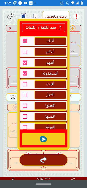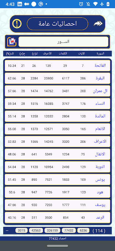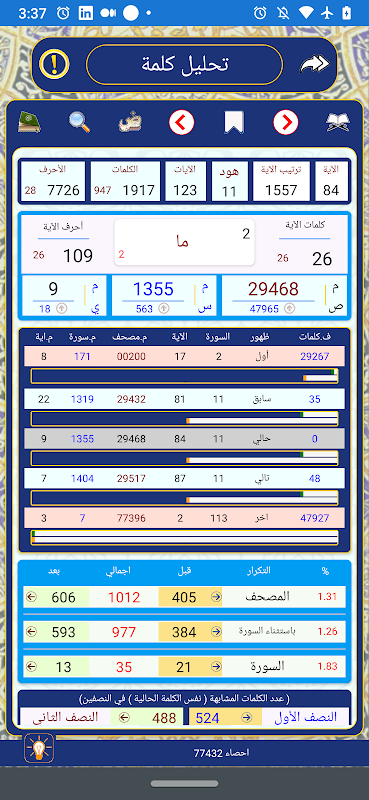 Het idee en het belangrijkste doel van de applicatie is om elk woord van de Heilige Koran statistisch te analyseren.