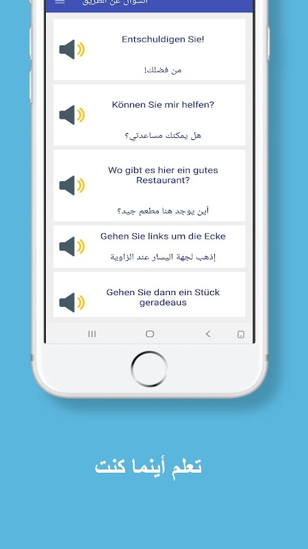 De applicatie bevat de belangrijkste woorden en zinnen in de Duitse taal vertaald in het Arabisch met de manier waarop het wordt uitgesproken met geluid en beeld