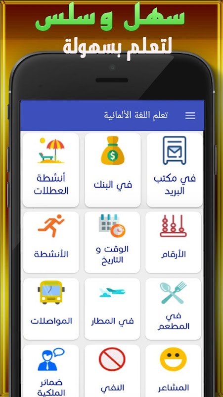 تعلم اللغة الالمانية بسهولة تطبيق المفيد جدا لتمكين من تعلم الالمانية دون الحاجة الى مدرس و ذلك عن طريق تعلم وتعليم اللغة الالمانية بالعربية بدون انترنت وذلك بواسطة ترجمة عربي الماني اي ترجمة من العربية الى المانية عن طريق الدروس في هذه اللغة.