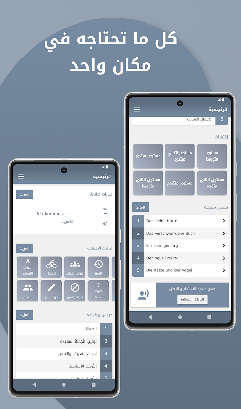 Eén sectie bevat een grote verzameling van de meest gebruikte zinnen in de Duitse taal, vertaald naar het Arabisch.