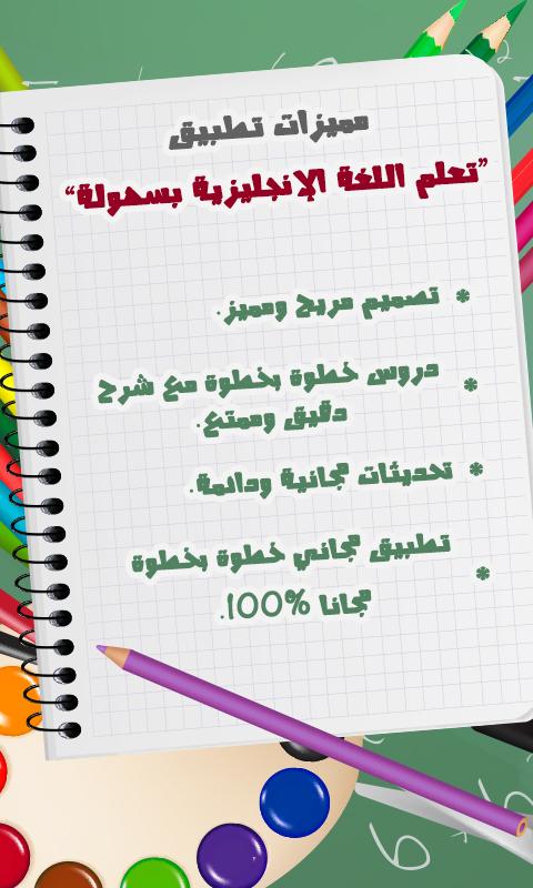 - تعلم اللغة الانجليزية مجانا حيث التطبيق مجاني 100% للابد وبتحديثات مستمرة.