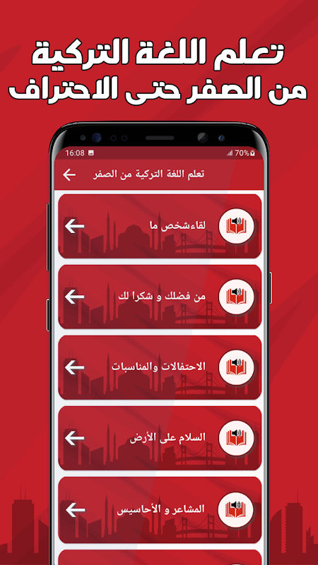Het onderwijzen van de Turkse taal zonder internet met audio en video voor beginners, het is een applicatie met een Turks-Arabisch woordenboek dat geschikt is voor iedereen die de Turkse taal wil leren zonder internet, en helpt liefhebbers van Turkse series en kanalen bij het begrijpen en Turkije in het Arabisch absorberen, en deze applicatie biedt je ook een reeks audiolessen en oefeningen om de taal Turks te leren zonder een leraar in een korte tijd door het leren van Arabisch-Turkse audio.