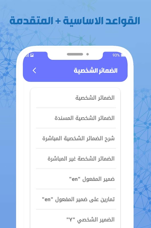 Alle lessen worden van het Frans naar het Arabisch vertaald, in detail uitgelegd en ondersteund door voorbeelden en tests, gevolgd door voornaamwoorden, werkwoorden en zinnen bij het leren van de Franse grammatica.