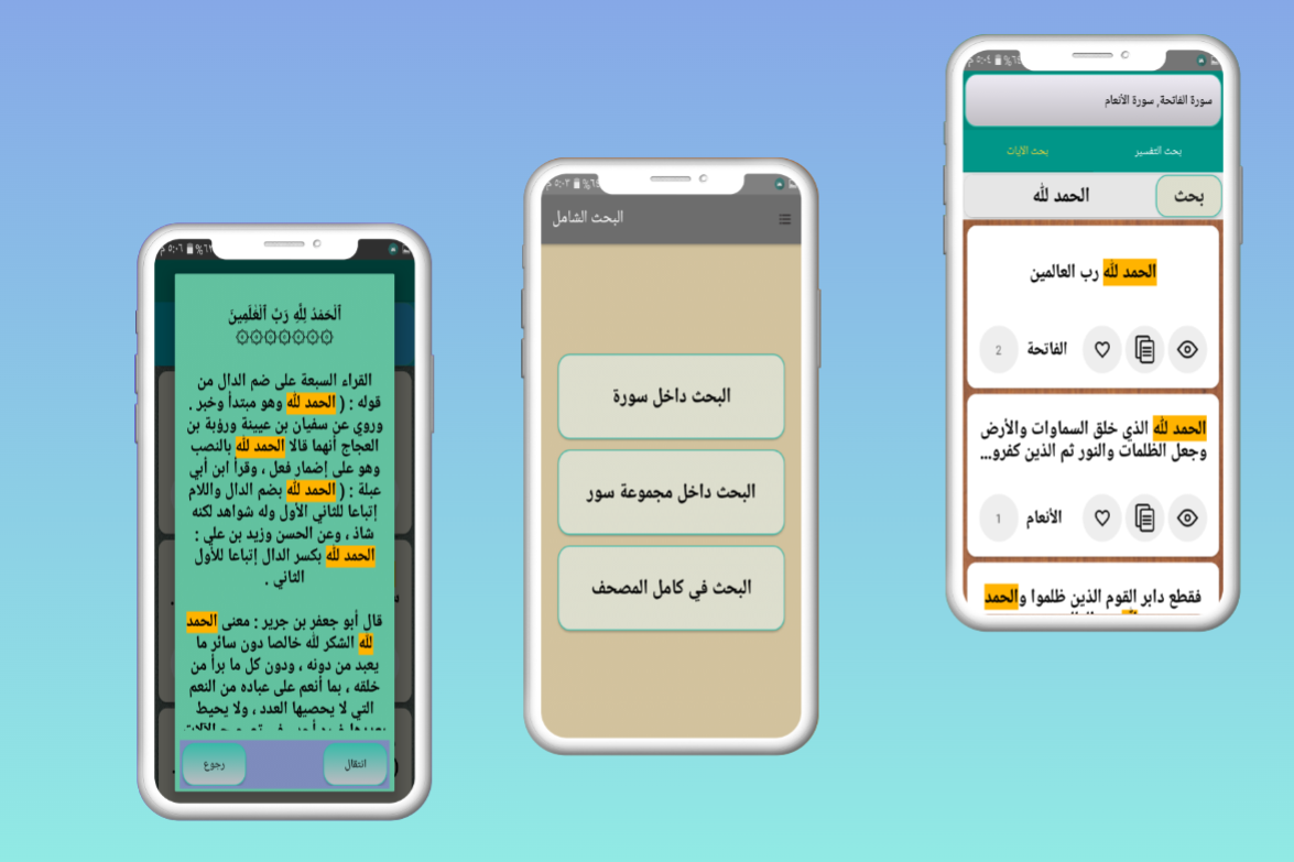◉ Een sectie om te zoeken binnen een opgegeven aantal soera's, afhankelijk van wat de gebruiker wil.
