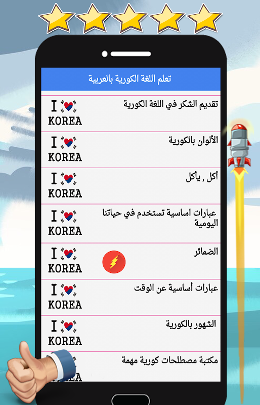 تطبيق "تعلم اللغة الكورية بالعربية" برنامج يساعدك في تكلم اللغه الكوريه المشهورة بالإضافة إلى جمل اساسية في اللغة الكورية و الأسماء و الألوان و بعض القواعد التي تساعدك ترجمة كورية الى العربية.
