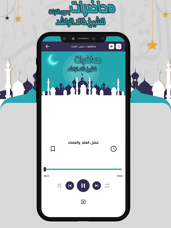Nadat je de applicatie hebt gedownload, kun je altijd en overal met gemak gratis naar invloedrijke lezingen luisteren in de stem van Khaled Al-Rashed.
