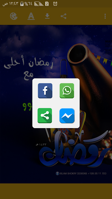 - مشاركة البطاقة والتصميم بإسمك من خلال كافة تطبيقات التواصل الاجتماعي او حفظها علي هاتفك لتعيينها كخلفية للجهاز