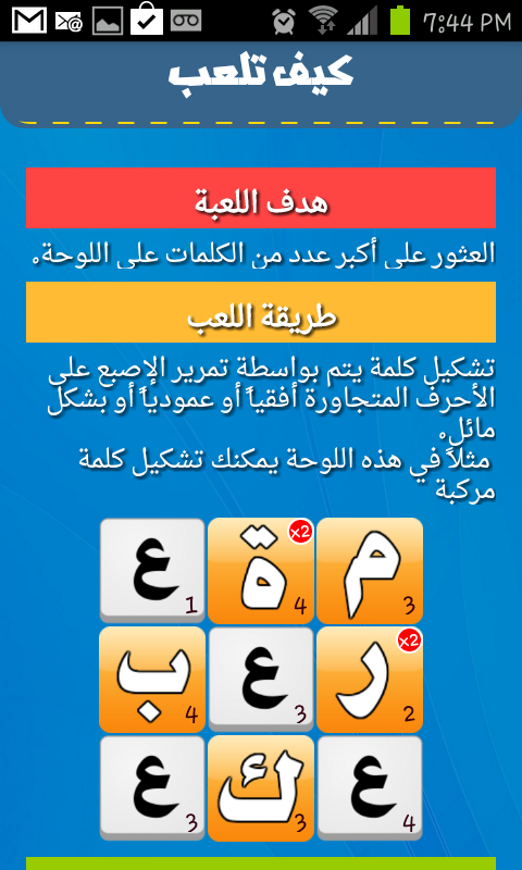 لعبة تسلية وترفيه تحتاج الى سرعة بديهة تركيز وثروة لغوية. امتحن مهاراتك وتحدى أصحابك.