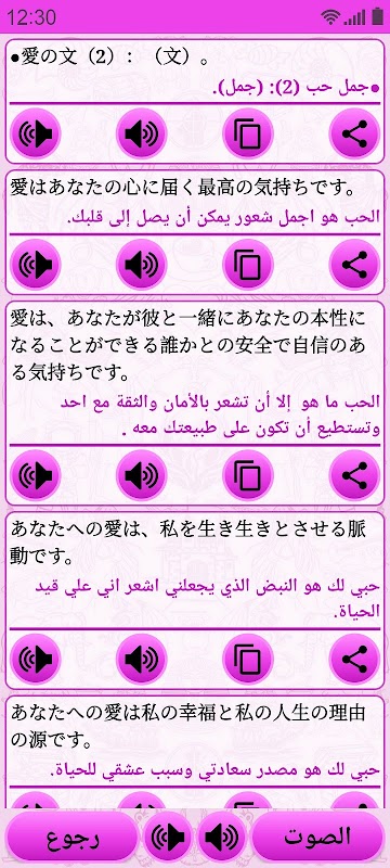 يدعم التطبيق ميزة "تحويل النص إلى كلام" وبالتالي يمكنك تعلم اليابانية بالصوت, وأيضاً يتضمن خاصية الإشعارات "Notifications" والشاشات المصغرة "Widgets" والتي تعرض في كل يوم جملة جديدة.