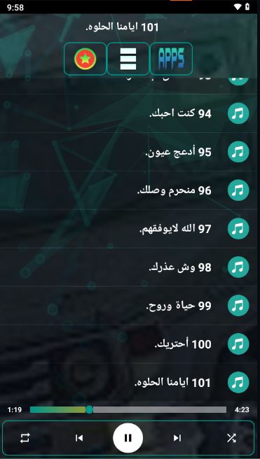 Je kunt de nieuwste nummers in deze applicatie ontdekken, aangezien de collectie regelmatig wordt bijgewerkt om ervoor te zorgen dat je naar de nieuwste muziekwerken luistert. Je vindt er ook een verzameling droevige liedjes die diepe gevoelens uitdrukken en harten raken, naast prachtige liedjes die de kunst van poëzie en traditionele melodieën in hun mooiste vormen belichamen.