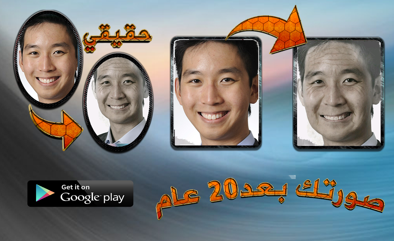 هدا التطبيق يمكنك من رؤية كيف سيبدو وجهك بعد 20 سنة كل ما عليك هو اختيار صورة لك او أخد واحدة جديدة بواسطة الكاميرا وسوف يقوم البرنامج بعدها بتعديل الصورة وإضافة ثأثيرات تجعل وجهك يبدو كأنك كبير في العمر .للإشارة التطبيق حقيقي ويمكنك تجربته بنفسك.