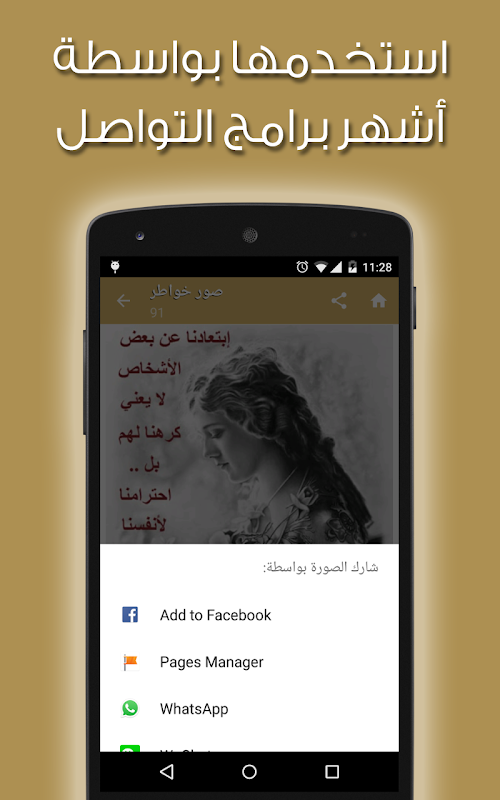 توقف الآن ... لقد وصلت إلى ما تريد ... صور خواطر تطبيق أكثر من رائع يمكنك من مشاركة أجمل صور خواطر راقية مع مختلف وسائل التواصل الاجتماعي مثل فيسبوك، تويتر، تانجو، واتس آب، وغيرها.
