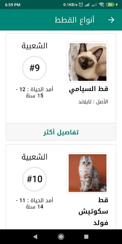 وليس هذا كل شيء فأيضا هناك مواضيع عن ثقافة العناية و الإهتمام بالقطط الأليفة، المواضيع نعمل على تحديثها كل يوم ويمكنكم تصفحها باستعمال صبيب أنترنيت حتى ولو كان ضعيف فالتطبيق خفيف ولا يستهلك أنترنيت كثير.