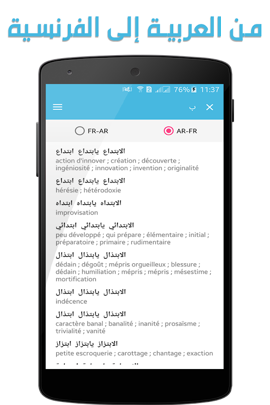 قاموس فرنسي عربي بدون نت أو قاموس الترجمة الفورية والإحترافية مزدوج بحيث يتيح الترجمة من اللغة العربية إلى الفرنسية والعكس أيضا الترجمة من الفرنسية للعربية بشكل إحترافي حيث يقترح عليك الكلمات بمجرد كتابة الحرف أو الحروف الأولى منها.