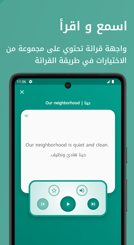 De app bevat een verzameling korte Engelse verhalen die in het Arabisch zijn vertaald. Je kunt de verhalen ook zin voor zin beluisteren en de betekenis in het Arabisch lezen.