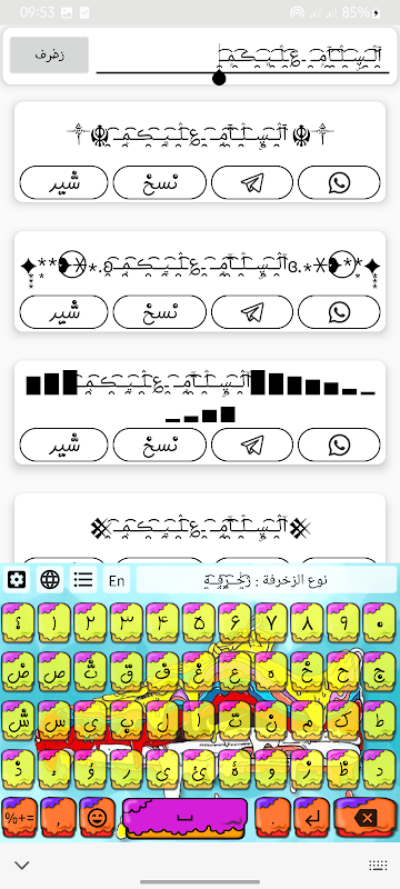 Een interface voor vormen die grappige, onderscheidende en expressieve vormen bevat die u kunt kopiëren of wijzigen voordat u ze kopieert en deelt via "Facebook", "WhatsApp", "versierd toetsenbord", u kunt de vorm naar de juiste persoon sturen of delen op Facebook, dierbaren en je beste vrienden