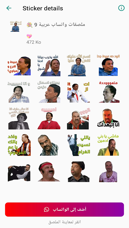 Het programma bevat veel grappige stickers en stripstickers voor WhatsApp, zoals: speelposters (Adel Imam, Al-Eyal Kabart, Al-Wad Sayed Shaghal), Egyptische stickers (Mohamed Saad, Al-Lambi), Gulf-stickers (Tash Ma Tash, Nasser Al-Qasabi, Abdullah Al-Sadhan) en nog veel meer! Als er suggesties zijn voor posters die u graag in de komende updates zou willen zien, neem dan contact met ons op en we zullen eraan werken om dit te bereiken.