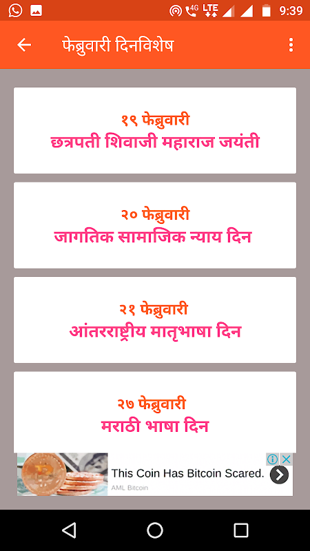 महिन्यातील महत्वाच्या दिवसांची माहिती दिलेली आहे .जे विद्यार्थी स्पर्धा परीक्षे साठी तयारी करत असतील ते हे अँप डाउनलोड करून सर्व महत्वाच्या दिवसांची माहिती घेऊ शकता .तसेच सामान्य ज्ञान म्हणूनही हे अँप वापरा.