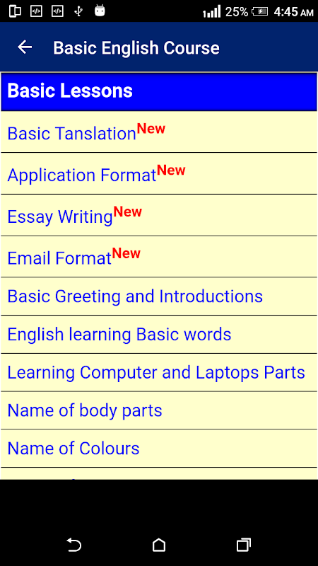 The app has been divided into four convenient units of Grammar, Pronunciation, Conversation and Vocabulary. Each chapter covers one main area of learning English - explained thoroughly with examples and special attention being given to the basic skills.