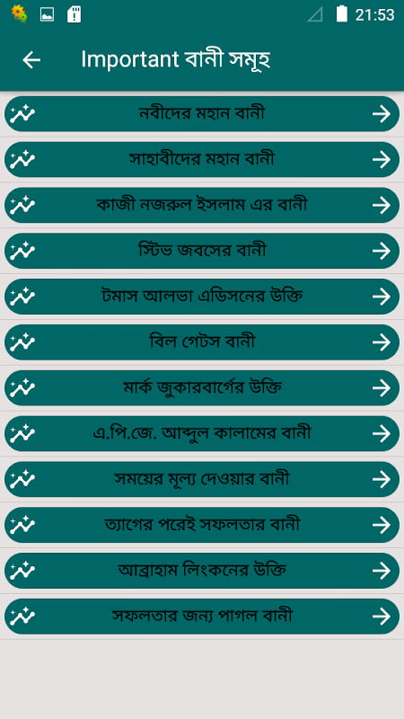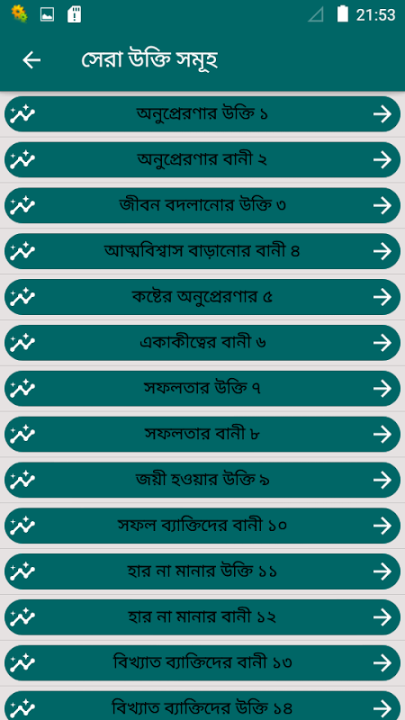 Motiverende Citaten - Motiverende Citaten De bekendste inspirerende woorden en uitspraken hebben de strijd van het leven gewonnen. Motiverende tips Vanuit deze app kun je citaten lezen van mensen die veel obstakels op hun weg zijn tegengekomen, maar ze hebben alle obstakels overwonnen. Motiverende Citaten in Bangla (Motiverende Citaten in Bangla) Maar het belangrijkste is dat ze nooit stopten met lopen, Abiram bleef lopen, dus het lukte.