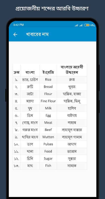 Hier vindt u gemakkelijk de betekenis van Arabische woorden in de Bengaalse taal. Voor het leren van de Arabische taal in het Bengaals, zal deze app je helpen. Deze app heeft veel hoofdstukken waar je Arabische woorden naar Bengaalse woorden kunt vertalen. Arabische woorden met Bengaalse betekenissen worden in de app ingevoegd. Er kan worden gezegd dat dit een app voor Arabische woordenschat is. Het is een belangrijke app voor het leren van de Arabische taal, omdat Arabische woorden betekenissen hebben in het Bengaals en in de uitspraak.