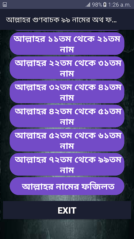 আল্লাহ তায়ালার ৯৯টি নাম নিয়ে বানানো আমাদের আজকের এই অ্যাপ। যেখানে ৯৯ টি নামের আরবি লেখা, বাংলা উচ্চারণ ও তার অর্থ সহ দেওয়া আছে।