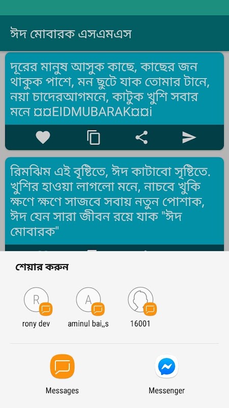 No longer have to write or search SMS. Here is the best Eid Mubarak SMS selected. From now on, SMS will be open to greet your beloved Eid with messages, messages on Messenger, Facebook, WhatsApp, Emo, and many more. Download e now and start sending sms. Direct message, copy and share. There are Send, Copy and Share buttons. Do not bother to copy and paste directly the send button will send the message to your message option. I hope you enjoy reading SMS.