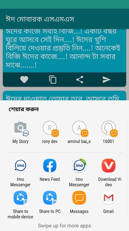 কষ্ট করে আর এসএমএস লিখতে বা খুঁজতে হবে না । এখানেই পাবেন সেরা বাছাইকৃত ঈদ মোবারক এসএমএস। এখন থেকে এসএমএস করবেন মন খুলে প্রিয় মানুষের ঈদের শুভেচ্ছা জানাতে ম্যাসেজে , মেসেন্জারে , ফেসবুকে , হোয়াটসএপে , ইমোতে , ইমেইলে এছাড়াও আরো অনেক । এখন ই ডাউনলোড করুন আর শুরু করুন এসএমএস পাঠানো । সরাসরি মেসেজ , কপি এবং শেয়ার করার সুবিধা আছে । এর জন্য রয়েছে সেন্ড ,কপি এবং শেয়ার বাটন । কষ্ট করে আর কপি পেস্ট করতে হবে না সরাসরি সেন্ড বাটনে টাচ করলেই আপনার মেসেজ অপসনে মেসেজটি চলে যাবে। আশা করি আপনি এস এম এস পড়ে অনেক আনন্দ পাবেন ।