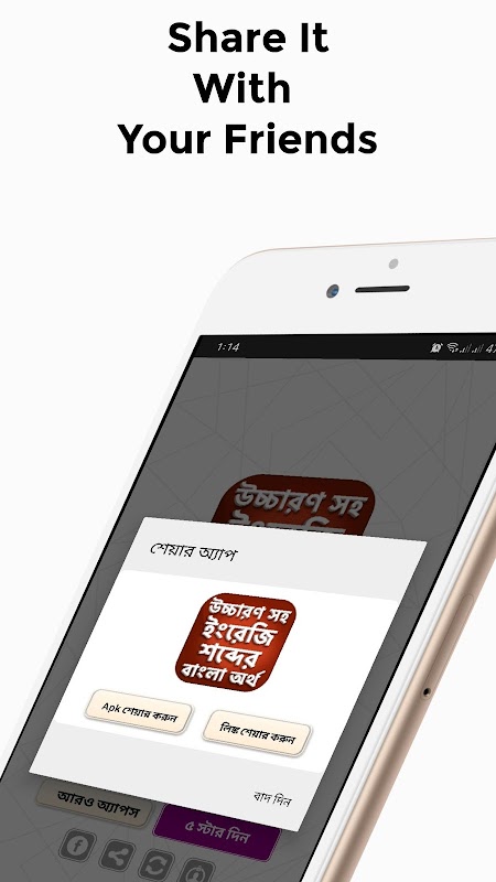 woordboek engels naar bangla is engels naar bangla woordenlijst voor hen die engels woord willen leren in bangla. Dit soort Engels naar Bangla woordboek telefoneren. als u het op elk gewenst moment gebruikt zonder gegevensverbinding. Als je een expert moet zijn in het Engels praten met Bengaals, dan moet je deze applicatie gebruiken. Naast gesproken Engels helpt deze telefonische bediening u om beter te worden in de Engelse woordenlijst. Het helpt je ook om met andere woorden elk woord in het Engels in het Bangla of Bangla in het Engels te zetten.