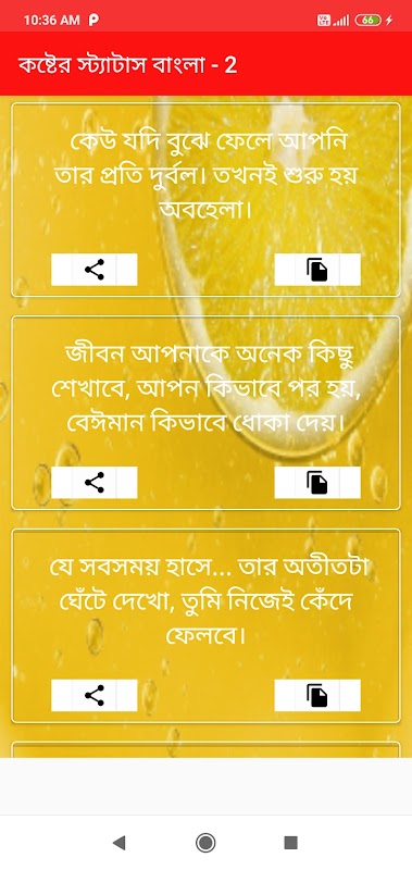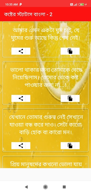 বাংলা কষ্টের স্ট্যাটাস App-টিতে রয়েছে বেশ কিছু বাস্তব জীবনের কষ্টের স্ট্যাটাস ও এসএমএস, আশাকরি আপনাদের মনের মতো স্ট্যাটাস এখানে পাবেন। বাংলা কষ্টের স্ট্যাটাস বা Sad Status Bangla App থেকে যে কাউকে খুব সহজেই স্ট্যাটাস পাঠাতে পারবেন।