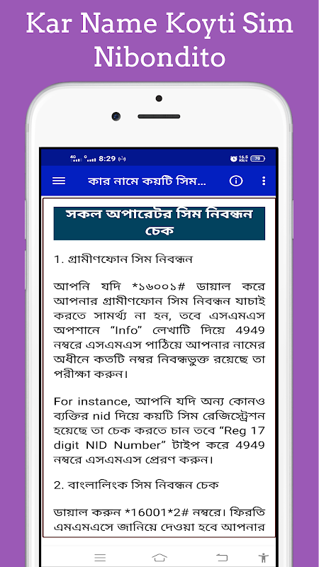 Het is een complete app voor biometrische simcontrole of simregistratiecontrole die het beste is voor hoeveel sim u in uw NID heeft. U kunt de naam koity sim nibondito controleren. Je kunt ook grameen sim, banglalink sim, robi sim airtell sim en teletalk sim nebondon check controleren.